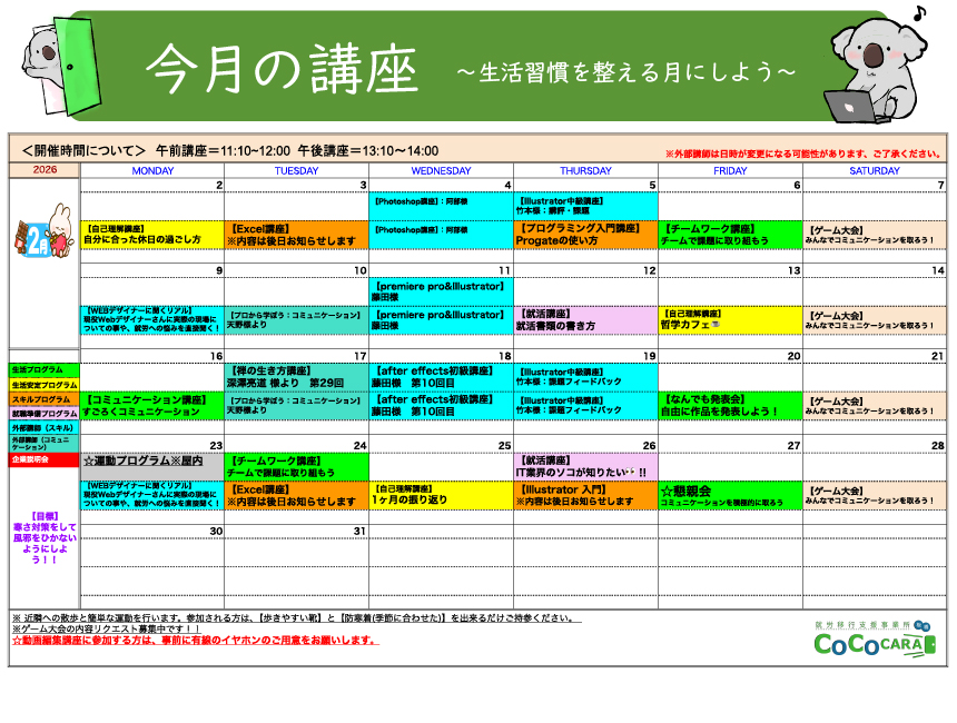 新着情報2026年2月の講座(板橋) Tweet Share Hatena Pocket RSS feedly Pin it生活習慣を整える月にしよう寒さが残る2月は、心と体のペースを整えるチャンスです。完璧じゃなくて大丈夫。生活リズム、集中できる環境、できる工夫を少しずつ増やしていきましょう。今月は“続けられる”土台をつくって、自信につなげていきましょう✨ 働きづらさの理由を探る~精神疾患の障害理解を深める3つの視点~前の記事 2026年2月の講座(池袋)次の記事